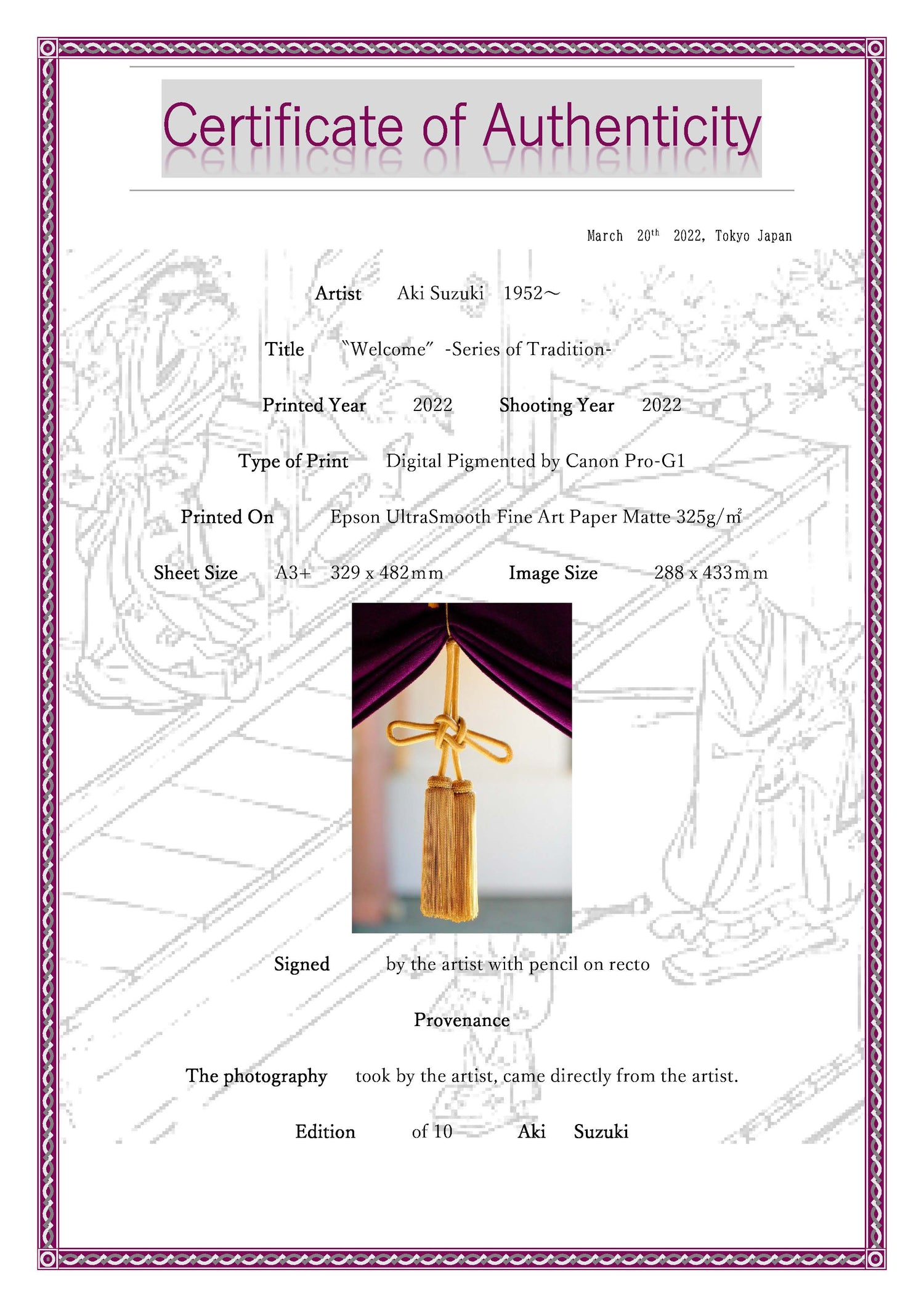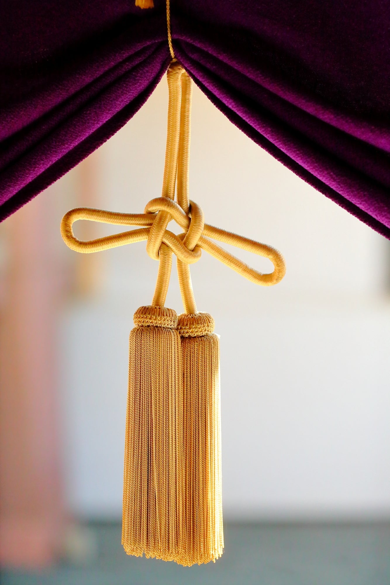 トラディション「ウェルカム(揚巻房)     ここは高畑不動尊境内の五部権現社。紫の布、神前幕(水引幕)は神聖な場所と俗世の結界を示す。黄金色の揚巻房は清めの道具。古典的な装飾にはこの房が結構多用されている。座布団の四隅や扇子、鎧兜等々の紐の上級バージョンだが全て清める意味が込められている。写真の揚巻房の結び方は「入型」の総角結びで福は内の意味で「人型」だと魔除けだ。そもそも日本では結ぶことには元来ポジティブな意味が多く含まれているらしいい。調べるとキリがない程奥が深い。そういう事とは露知らず出来上がった作品がこれ。紫と黄色のコンビネーションが絶妙で、布と紐の構図的なバランスもいい。その布と紐の正絹の質感がまた素晴らしい。そしてこの飾りの意味は「ウェルカム」だ。