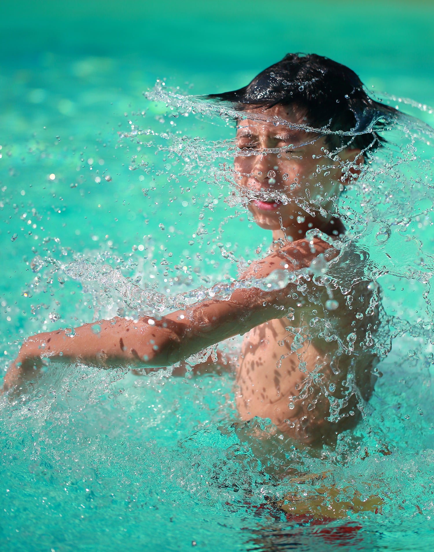 この作品の醍醐味は何といってもモデルのマックから飛散している無数の水滴。この無数の飛沫にガッチリとピントが合っている。神技に近い。奥のプールの水面は全くボケている。実はマックの顔にすらピンが来ていない。が、水滴群の写り具合が素晴らしいので全く気にならない。レンズは開放のF値2.8、シャッタースピードなんと1/5000秒。なのでバックのエメラルドグリーンの水がボケて被写体を際立たせている。