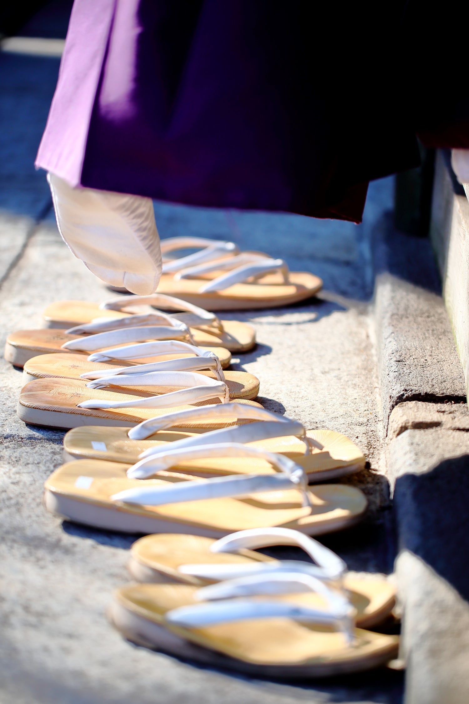 神社の本殿横の(正面でない)上り口に神官方が残していった雪駄群。これを見た瞬間、「日本も終わりだ」という思いが走った。神社という神聖な処で神職の方々が草履も揃えていかない? が、よく考えて見たら神様に背を向けてはいけないのだからこれは正解だ。訪問先によって正しい脱ぎ方が違う。マナーというのは結構複雑なものだ。すっかり靴が主流の世の中になったが、雪駄が好きという粋な吾人もたまに見かける。男のロマンのようなものを感じる。草履・雪駄は健康にもよさそうだ。ところで話はとぶが角界では、雪駄は三段目以上でないとはけない。それ以下は下駄か裸足。三段目は素足に雪駄、幕下が黒足袋に雪駄、関取になってやっと白足袋に畳の雪駄がはける。一つのトラディショナルにはそれに輪をかけるように幾重もの仕来りが付いてくる。